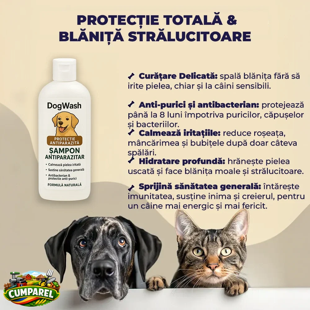 Majoritatea șampoanelor doar curăță. DogWash™ face mai mult: combate paraziții, calmează pielea, îngrijește blana și ajută la prevenirea problemelor pe termen lung.