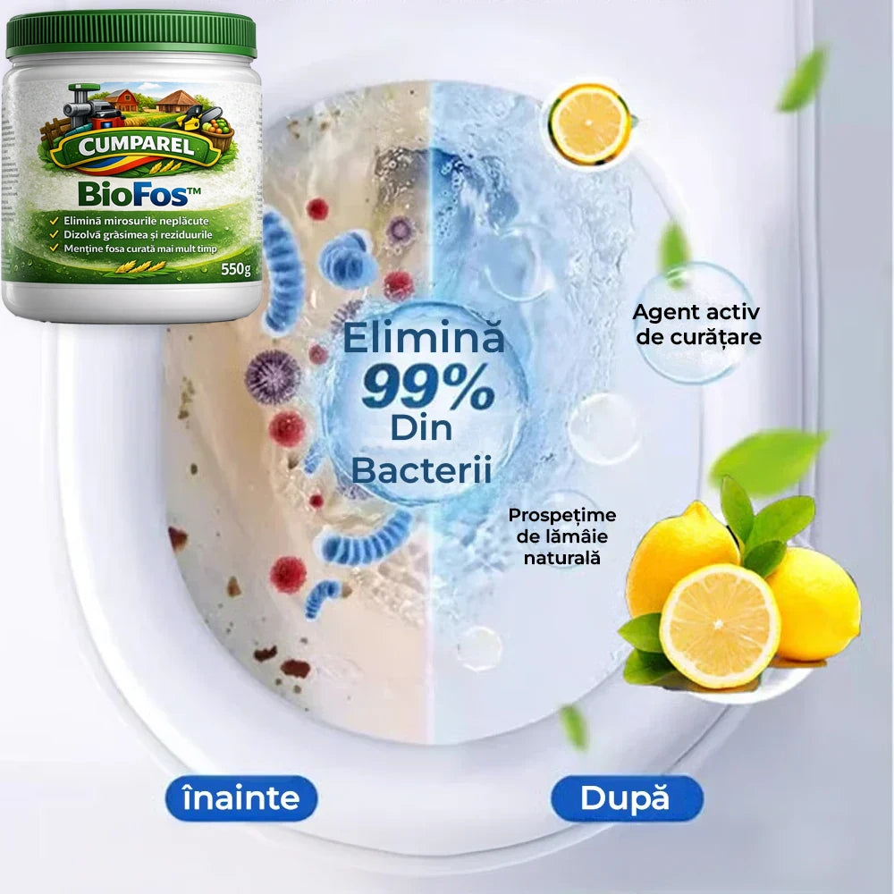 În loc să mascheze mirosul, BioFos™ îl elimină din sursă, refăcând echilibrul natural din fosă. Rezultatul: o fosă mai curată, fără mirosuri neplăcute și cu funcționare optimă pe termen lung.
